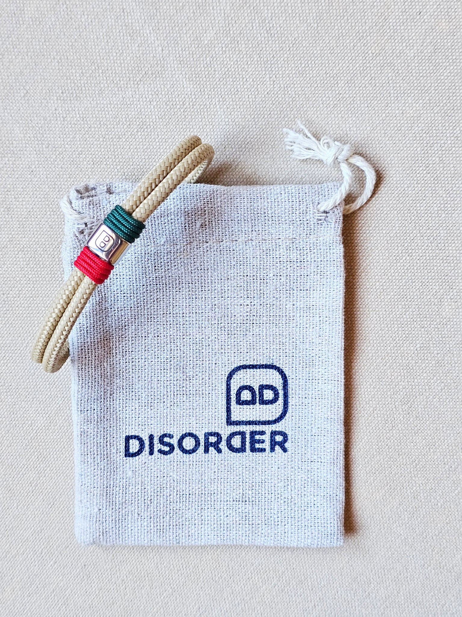 Pulsera realizada a mano en cordón náutico de nylon de 4 y 5 mm de diámetro en color azul marino o beige a elegir con hilos en color rojo y verde oliva en los lados, cordón doble con pieza en central en acero como detalle principal; El cierreestá fabricado en acero quirúrgico
