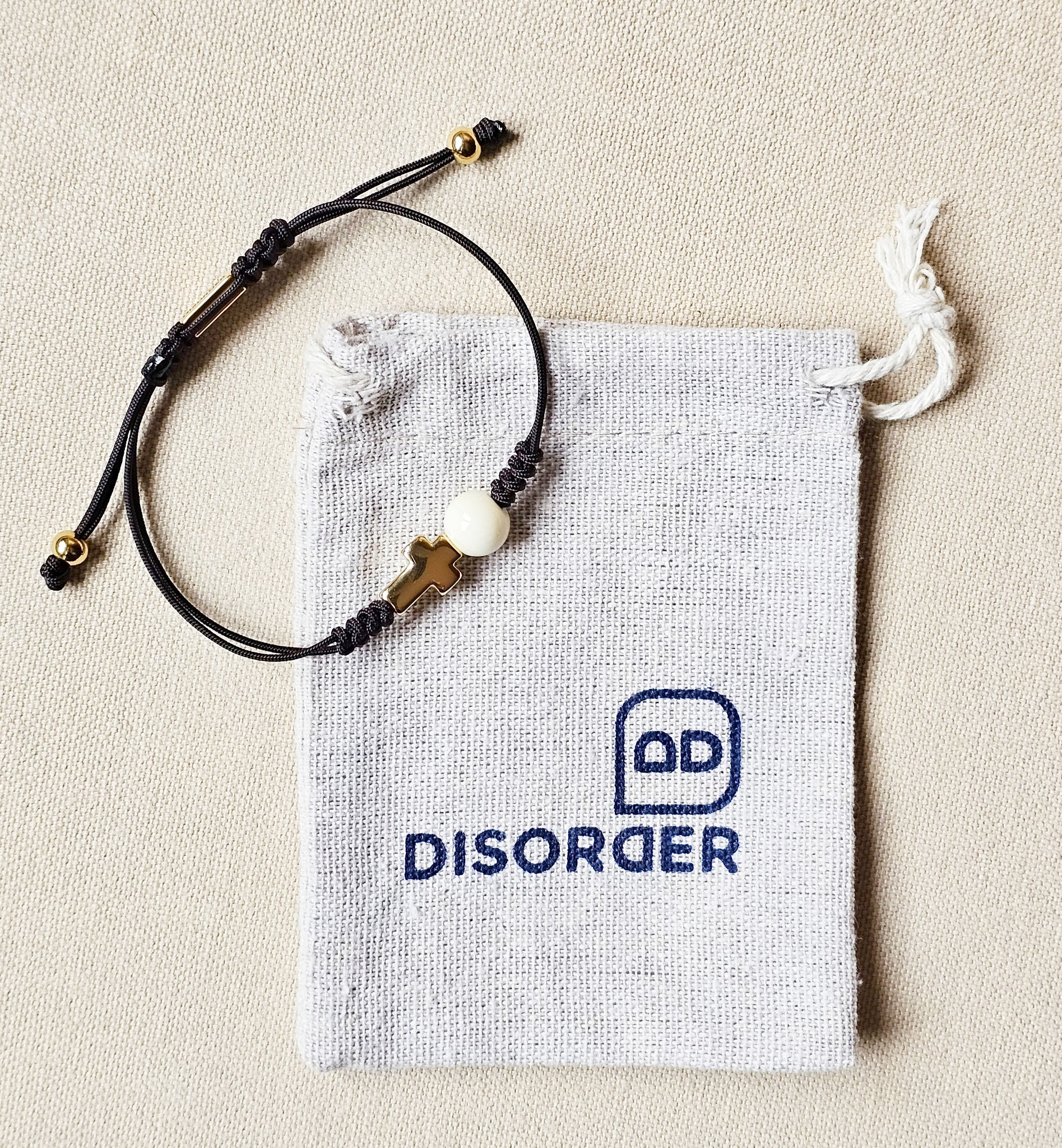 Pulsera ajustable ( talla única) hecha a mano en cordón de nylon de color marrón de 1.2 mm de grosor, lleva una cruz dorada como pieza central en acero inoxidable 316 y detalle de una bola de MURANO en color CREMA; cierre ajustable a modo de taba dorada de acero inoxidable 316 para mayor comodidad con dos bolas más en las puntas.