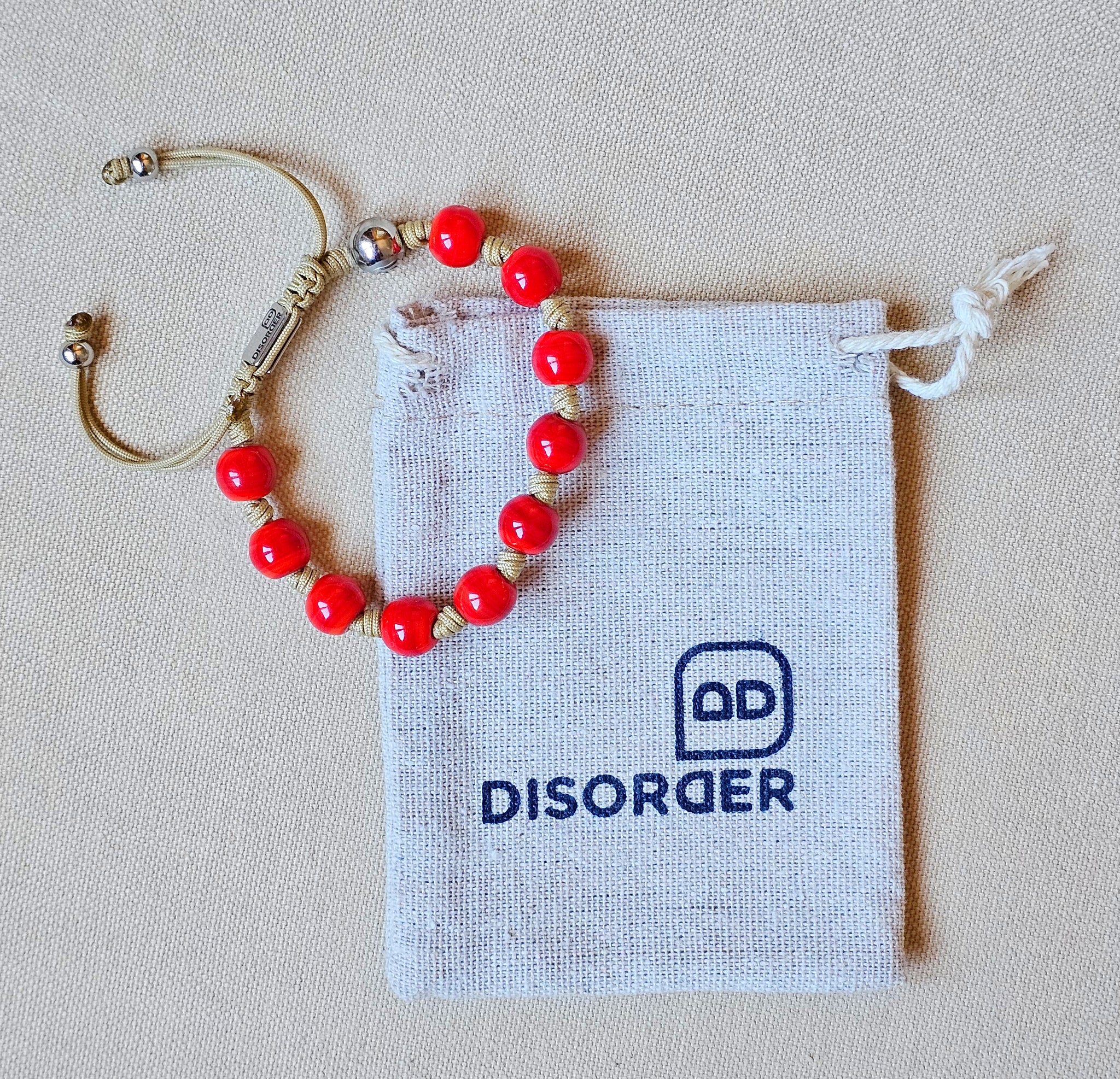 Pulsera ajustable realizada a mano en cordón de nylon en color beige de 1.2 mm de grosor, con bolas de 10 mm de CRISTAL DE MURANO en color ROJO, como detalle lleva una pieza en de acero inoxidable 316 grabado a láser con la marca DISORDER ; cierre ajustable de Acero.