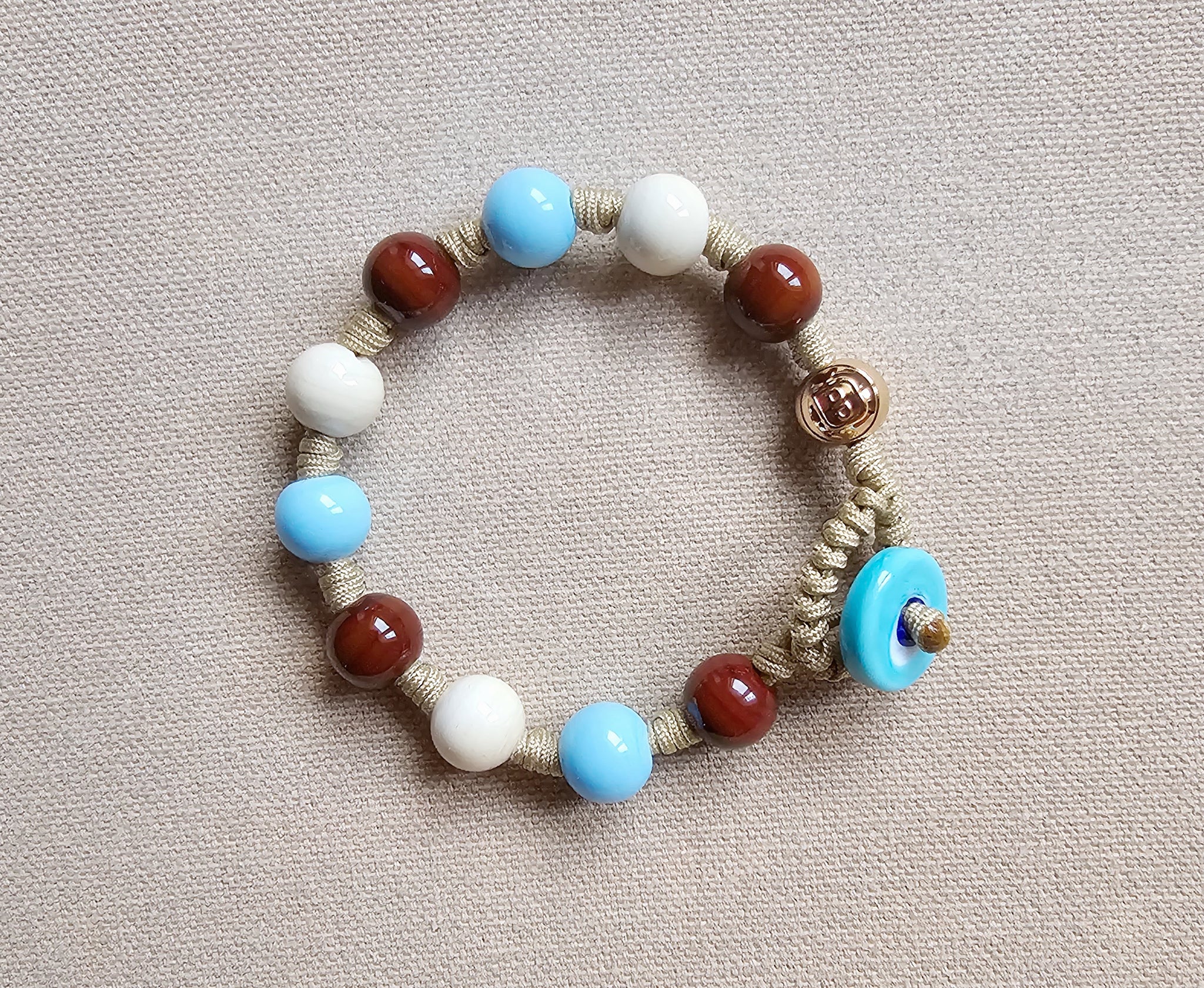 Pulsera ajustable realizada a mano en cordón de nylon en color beige de 1.2 mm de grosor, con bolas de 10 mm de CRISTAL DE MURANO en colores, CREMA, MARRÓN Y CELESTE variados, como detalle lleva una pieza en de acero inoxidable en dorado 316 grabado a láser con la marca DISORDER ; cierre ajustable a modo con un BOTÓN de Murano.