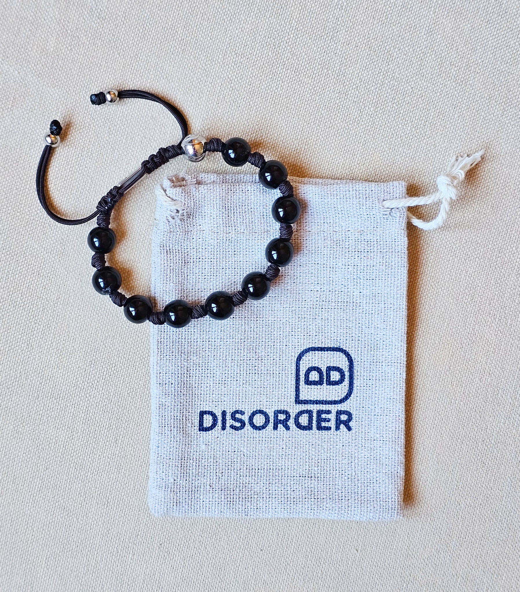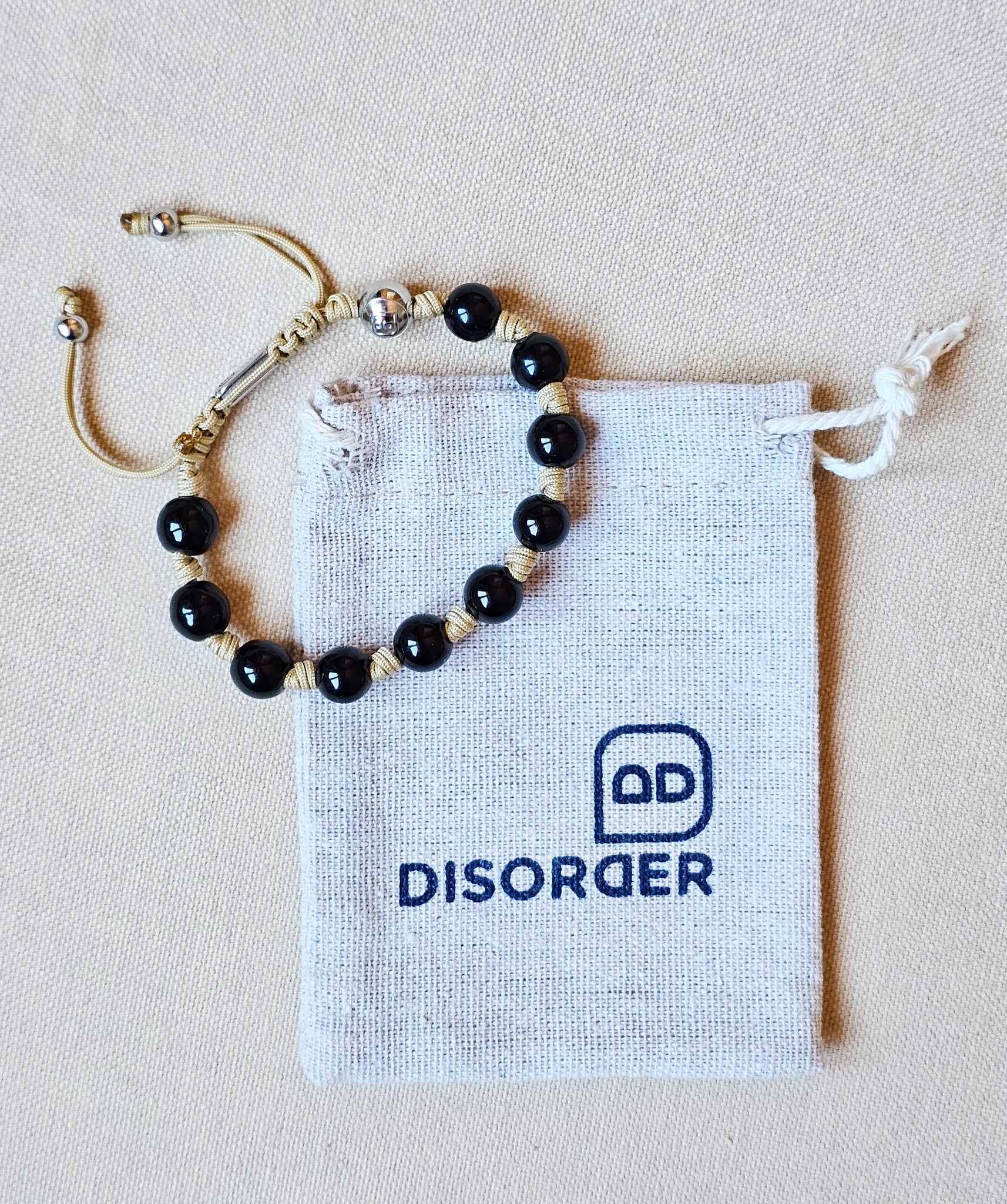 Pulsera ajustable realizada a mano en cordón de nylon en color marrón oscuro o beige de 1.2 mm de grosor, con bolas de 10 mm de CRISTAL DE MURANO en color NEGRO, como detalle lleva una pieza en de acero inoxidable 316 grabado a láser con la marca DISORDER ; cierre ajustable de Acero.