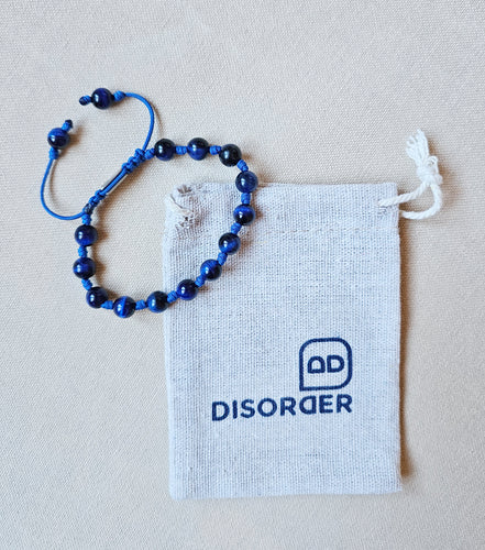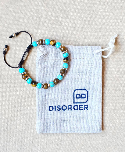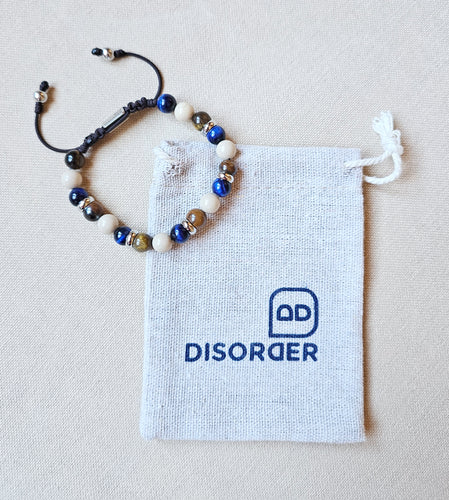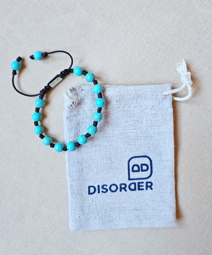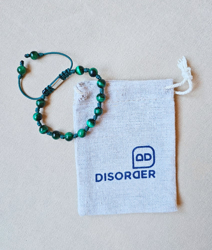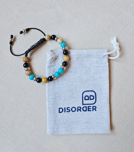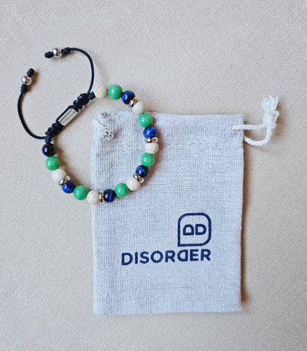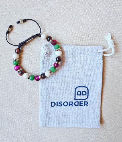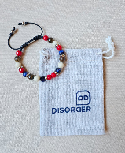 Pulsera TALLA ÚNICA AJUSTABLE realizada a mano en cordón nylon de 1.5 mm de grosor en colores a elegir, con bolas de piedras naturales de 8mm de diámetro separadas por un nudo doble; cierre ajustable muy cómodo con una "Taba" grabada a láser con nuestra marca DISORDER , terminación de la pulsera con dos bolas iguales en las puntas.