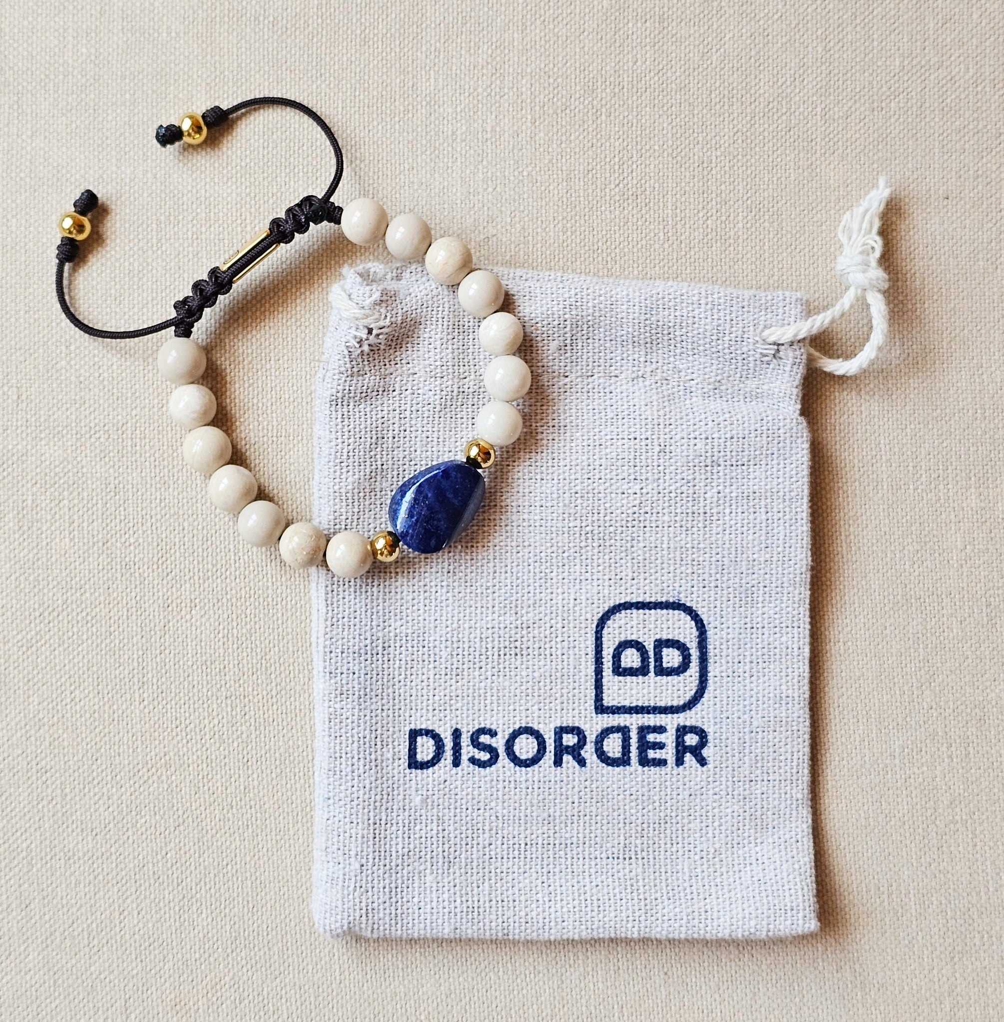 Pulsera TALLA ÚNICA AJUSTABLE realizada a mano en cordón de nylon de color marrón oscuro de 1.5mm con bolas de 8mm Jade Crema; lleva una pieza central en Lapislázuli y detalle con bolas de acero dorado; cierre ajustable con “taba” grabada a láser en acero inoxidable y dos bolas más en ambas puntas.