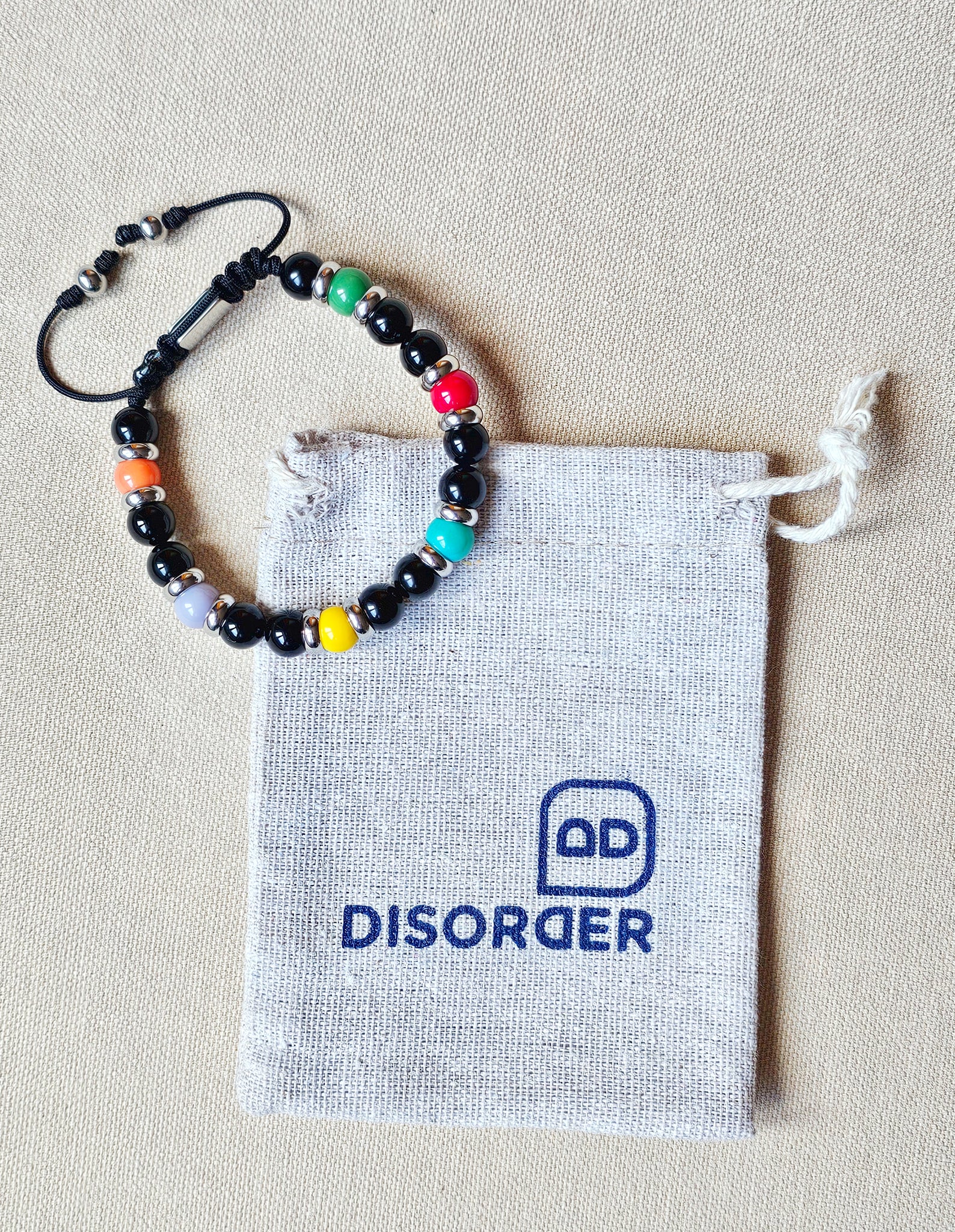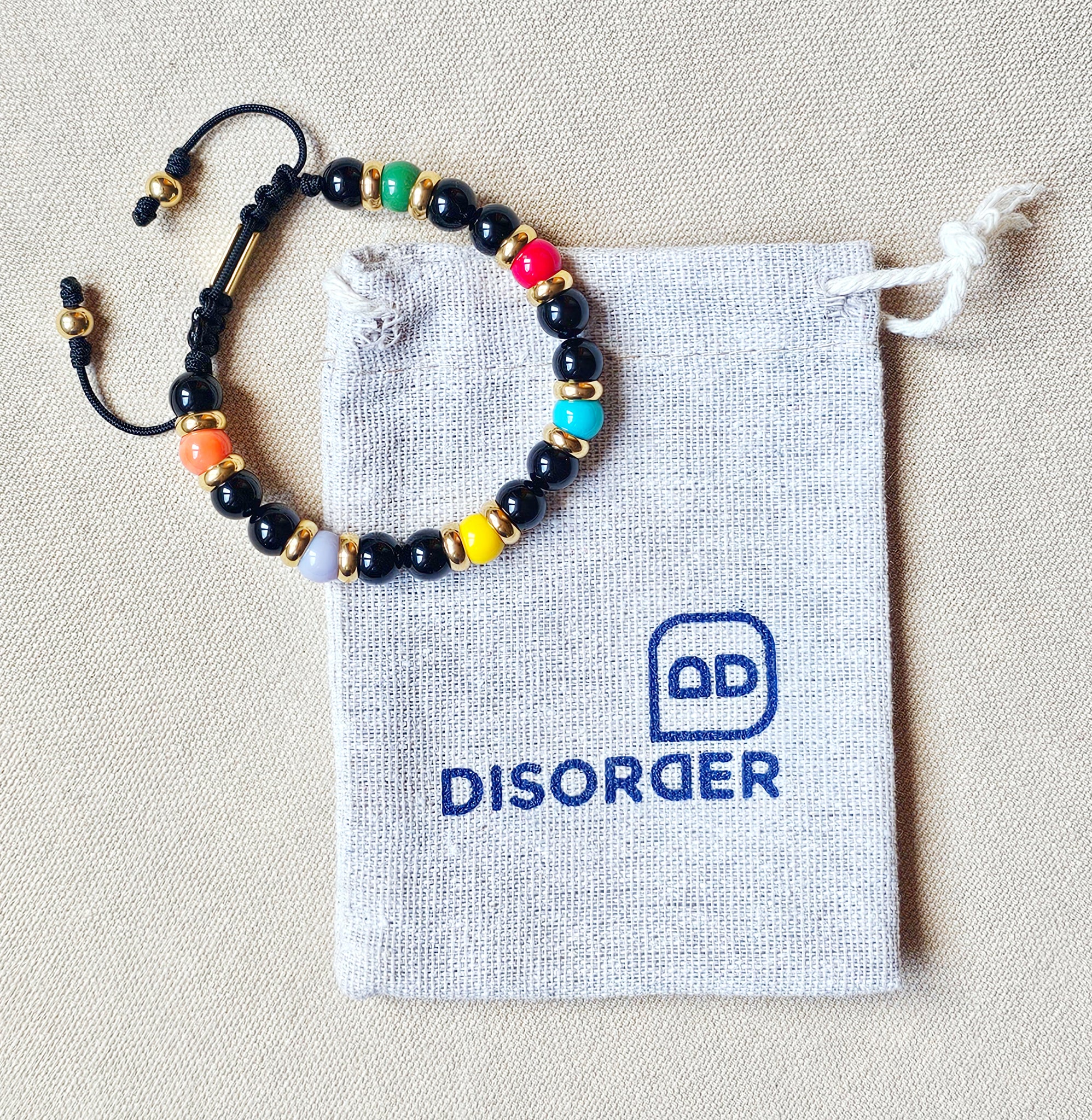 Pulsera TALLA ÚNICA AJUSTABLE realizada a mano en cordón de nylon de color negro de 1.5 mm de grosor, con bolas de piedras naturales 8mm de diámetro de ONIX EN NEGRO y  BOLAS DE CRISTAL EN COLORES separadas por DISCOS DE ACERO EN DORADO - PLATEADO ; lleva un cierre ajustable a modo de taba de acero inoxidable antialérgico 316 para mayor comodidad con dos bolas más en las puntas.