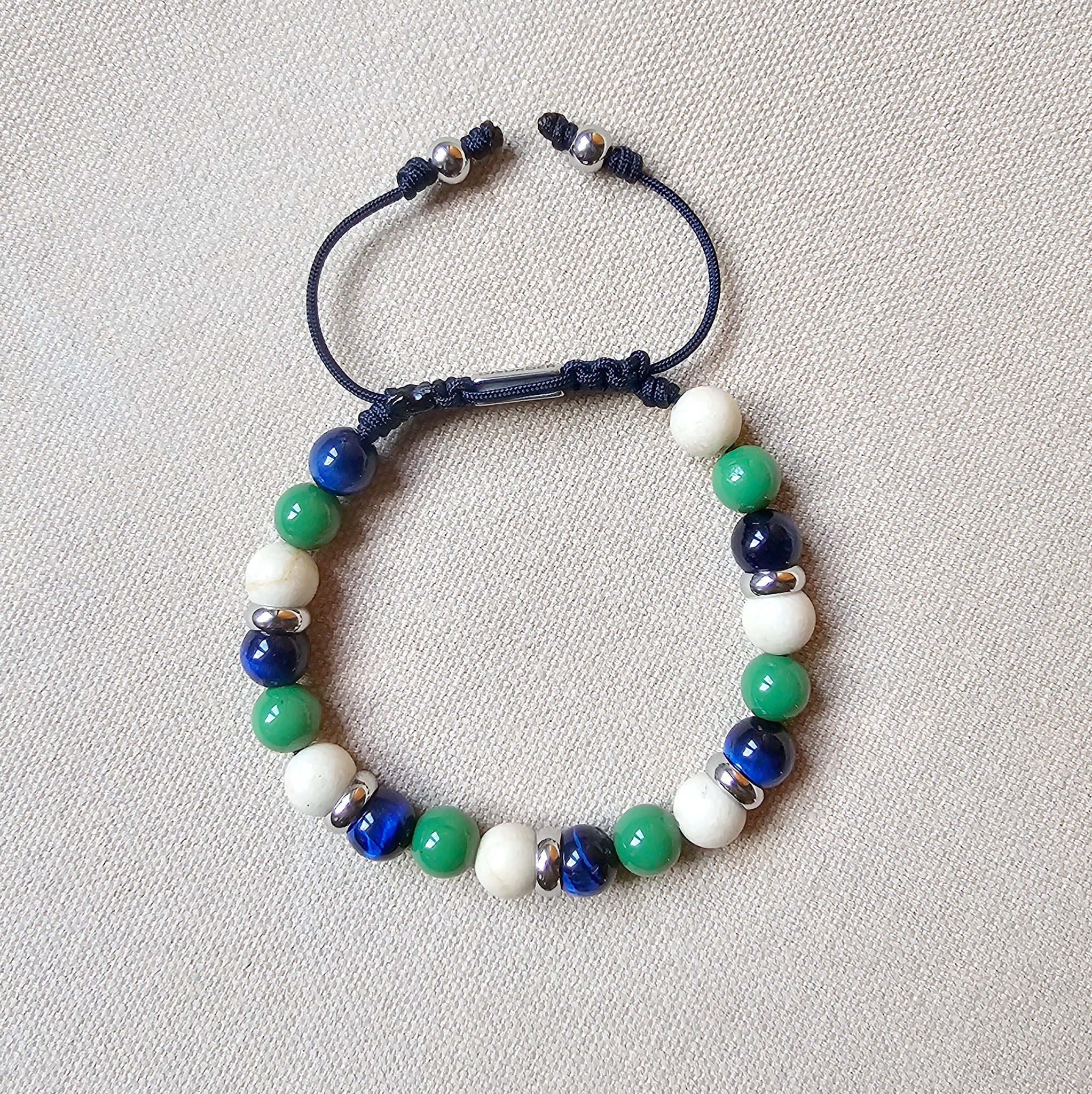 Pulsera TALLA ÚNICA AJUSTABLE realizada a mano en cordón de nylon marino de 1.2 mm de grosor con bolas de 8 mm de diámetro ojo de tigre azul , jaspe crema y cristal verde , ,combinadas con discos de acero; lleva el cierre ajustable a modo de taba de acero inoxidable para mayor comodidad con dos bolas combinadas en las puntas.