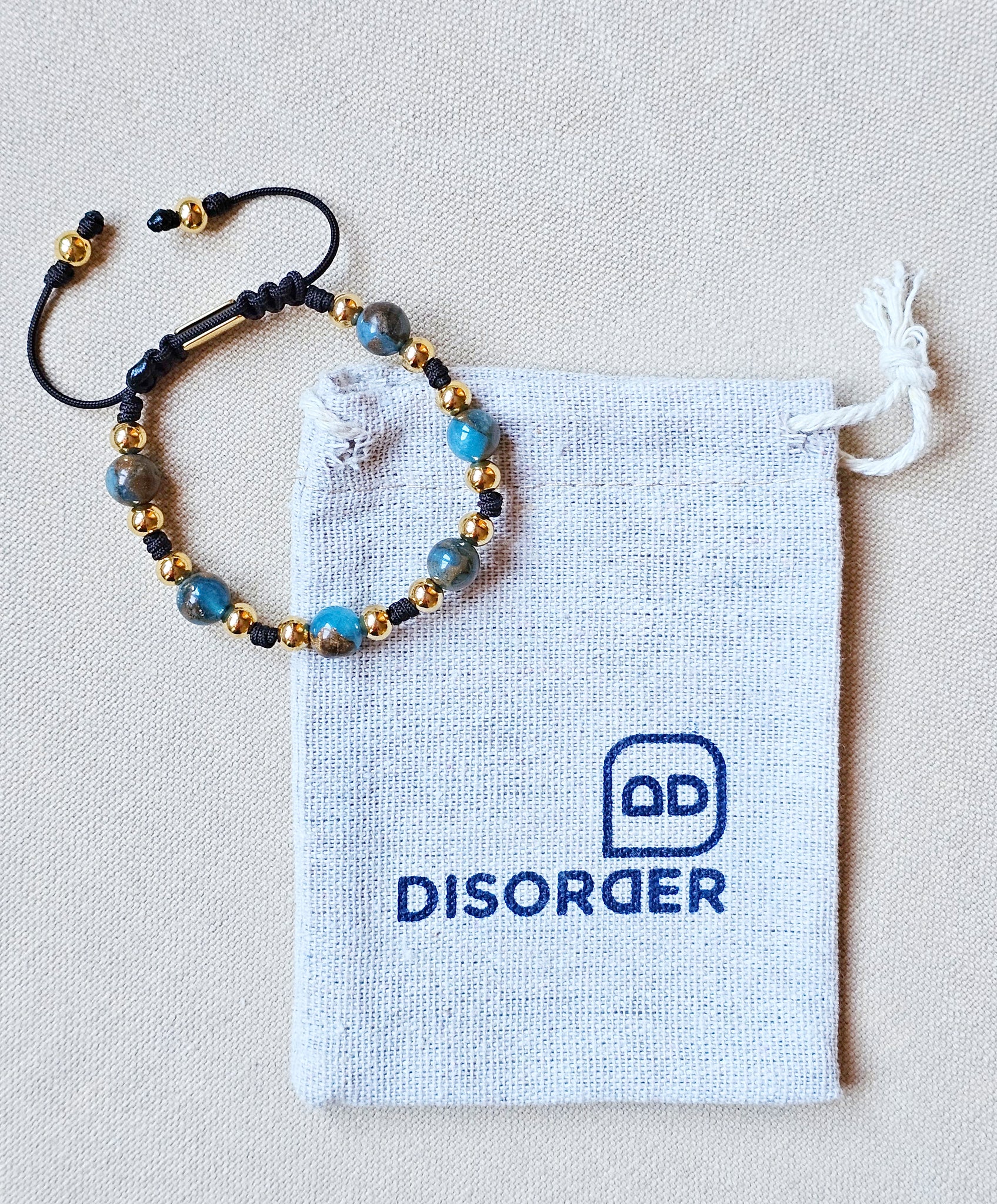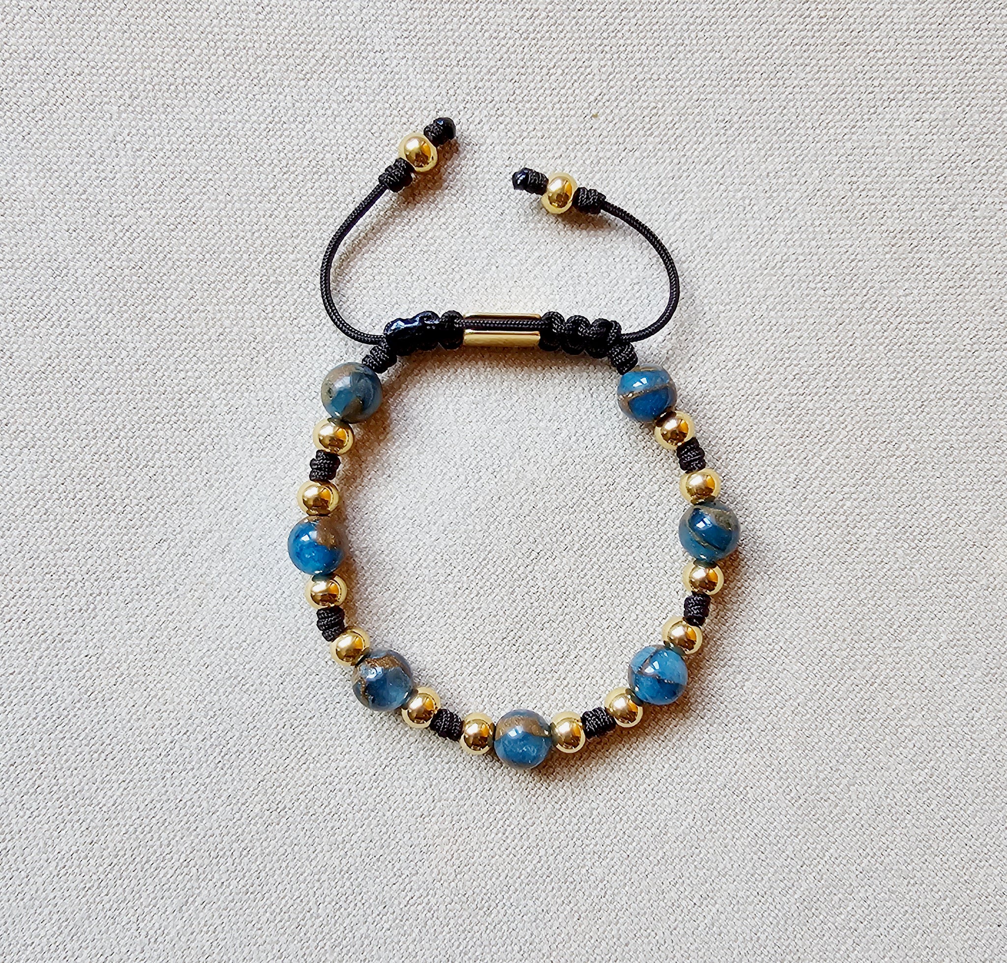 Pulsera TALLA ÚNICA AJUSTABLE realizada a mano en cordón de nylon de color marrón de 1.2 mm de grosor, con bolas de piedras 8 mm de diámetro EN COLOR MARRÓN AZULADO, ambas facetadas, con BOLAS DE ACERO DORADAS; lleva un cierre ajustable a modo de cierre de acero inoxidable anti-alérgico.