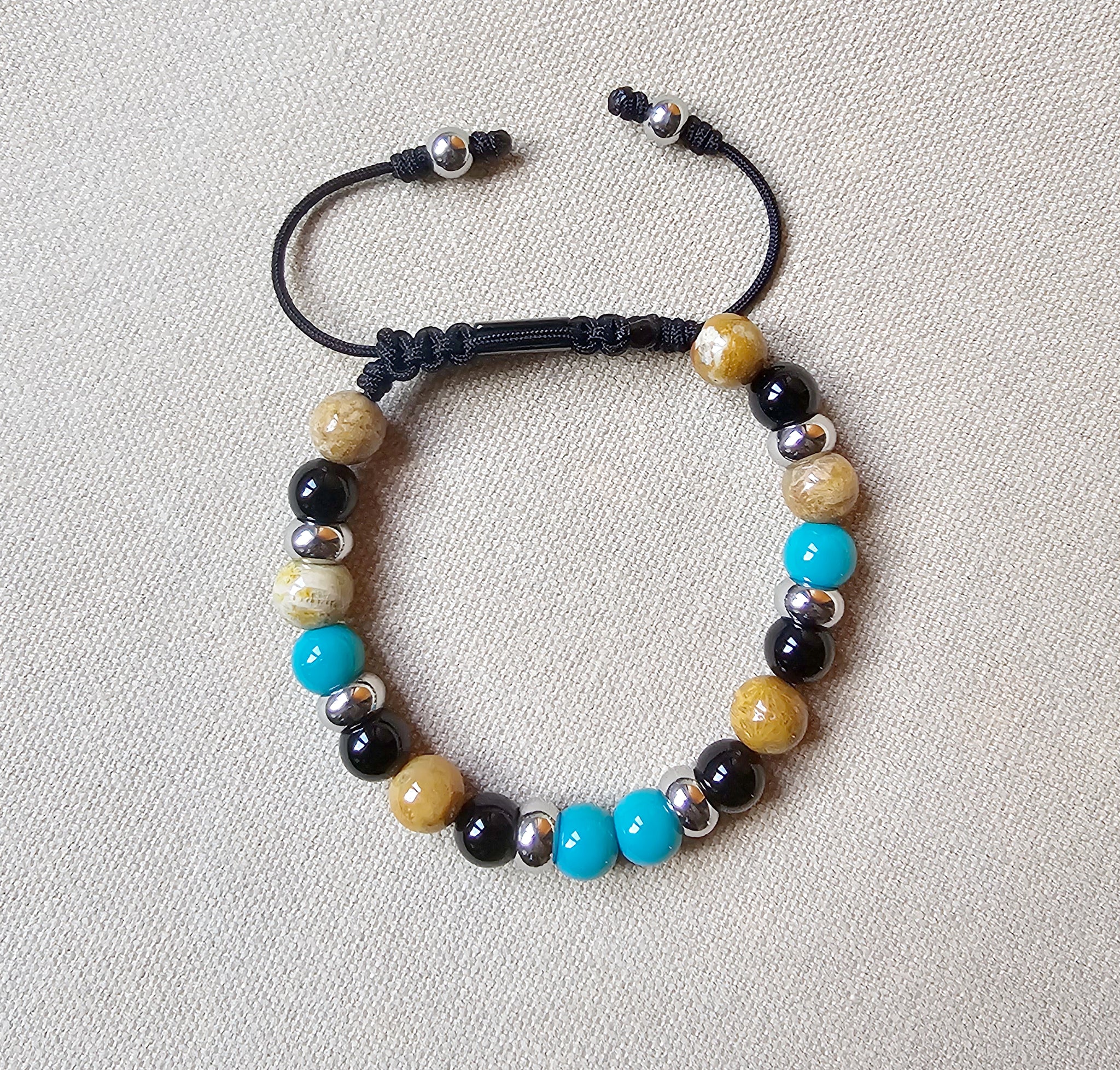 Pulsera TALLA ÚNICA AJUSTABLE realizada a mano en cordón de nylon marrón de 1.2 mm de grosor con bolas de 8 mm de diámetro, jade natural, bolas de cristal turquesa y negro , combinadas con discos de acero; lleva el cierre ajustable a modo de taba de acero inoxidable para mayor comodidad con dos bolas combinadas en las puntas.