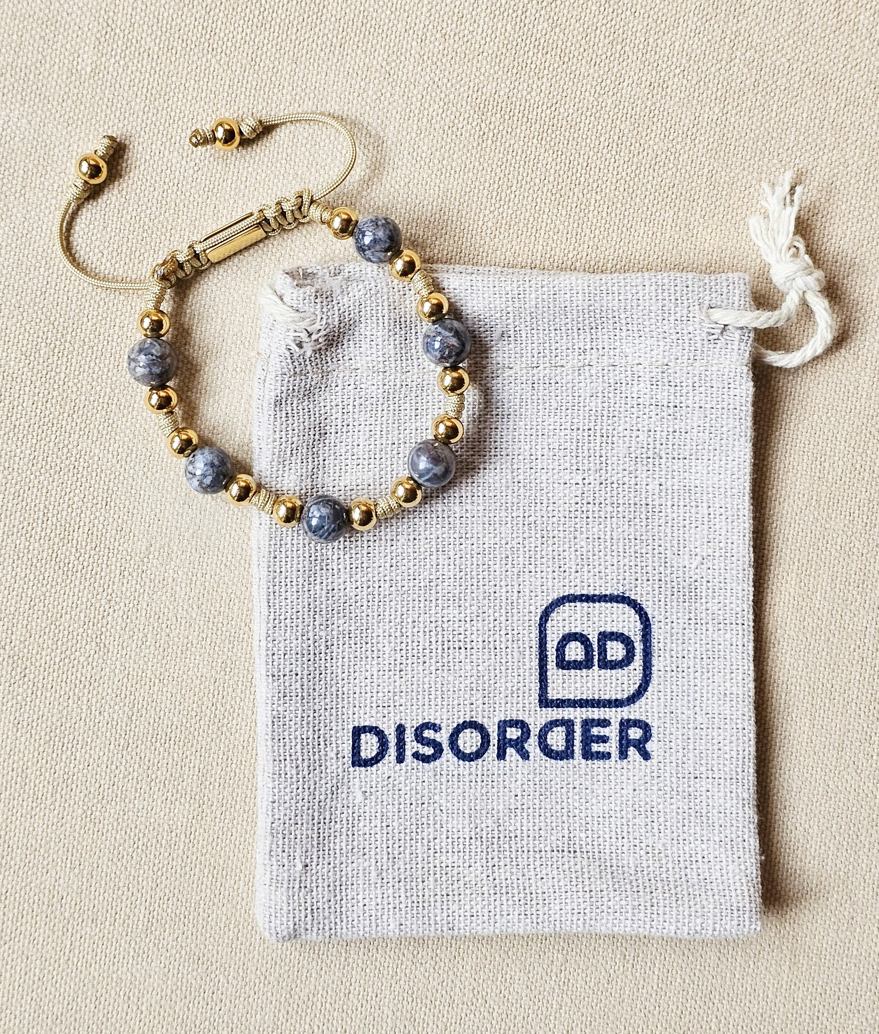 Brazalete de TALLA ÚNICA AJUSTABLE realizado en cordón de nylon de color beige de 1.5mm con bolas MAGNESITA en color GRIS Y acero dorado; cierre ajustable con acabado dorado grabada a láser en acero inoxidable para mayor comodidad y bolas más en ambas las puntas.