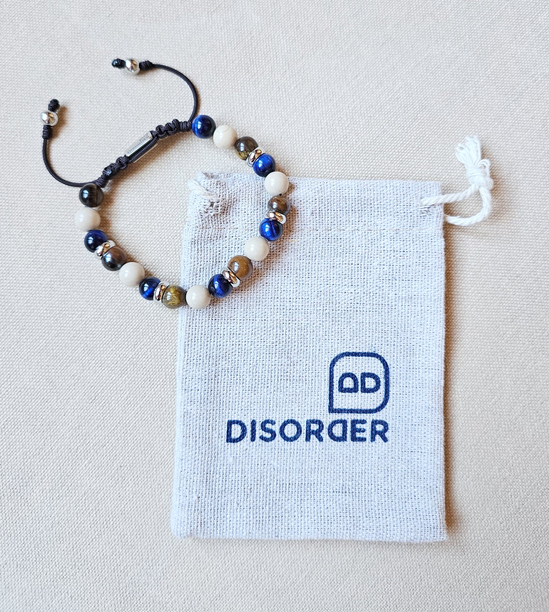 Pulsera TALLA ÚNICA AJUSTABLE realizada a mano en cordón de nylon marrón de 1.2 mm de grosor con bolas de 8 mm de diámetro ojo de tigre azul , marrón y jaspe crema, combinadas con discos de acero; lleva el cierre ajustable a modo de taba de acero inoxidable 316 para mayor comodidad con dos bolas combinadas en las puntas.