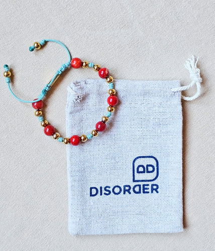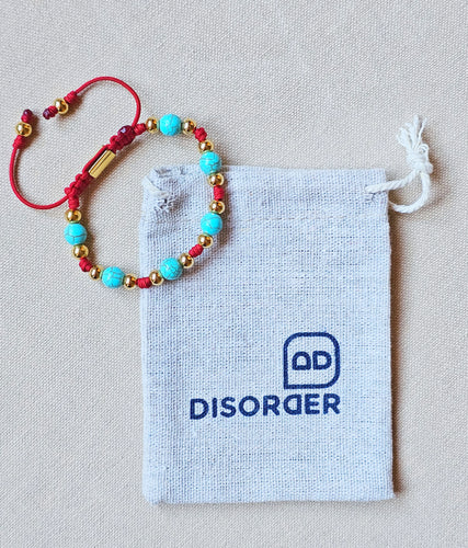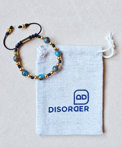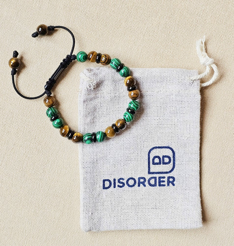 Pulsera TALLA ÚNICA AJUSTABLE realizada a mano en cordón nylon de 1.5 mm de grosor en colores a elegir, con bolas de piedras naturales de 8mm de diámetro separadas por un nudo doble; cierre ajustable muy cómodo con una "Taba" grabada a láser con nuestra marca DISORDER , terminación de la pulsera con dos bolas iguales en las puntas.