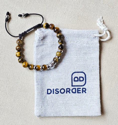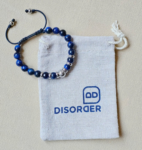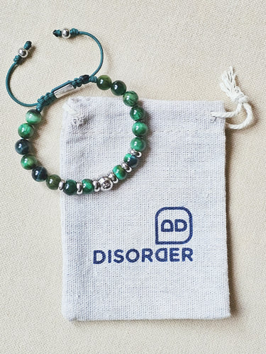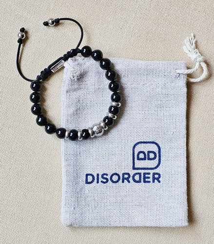 Pulsera TALLA ÚNICA AJUSTABLE realizada en cordón de nylon de colores a elegir de 1.5mm de grosor , bolas de 8mm de piedras naturales, con piezas de acero combinadas y bolas de acero inoxidable; PIEZA CENTRAL CON EL LOGO DE LA MARCA también en acero; cierre ajustable muy cómodo con una "Taba" grabada a láser con nuestra marca DISORDER , terminación de la pulsera con dos bolas de 5 mm de acero en las puntas.